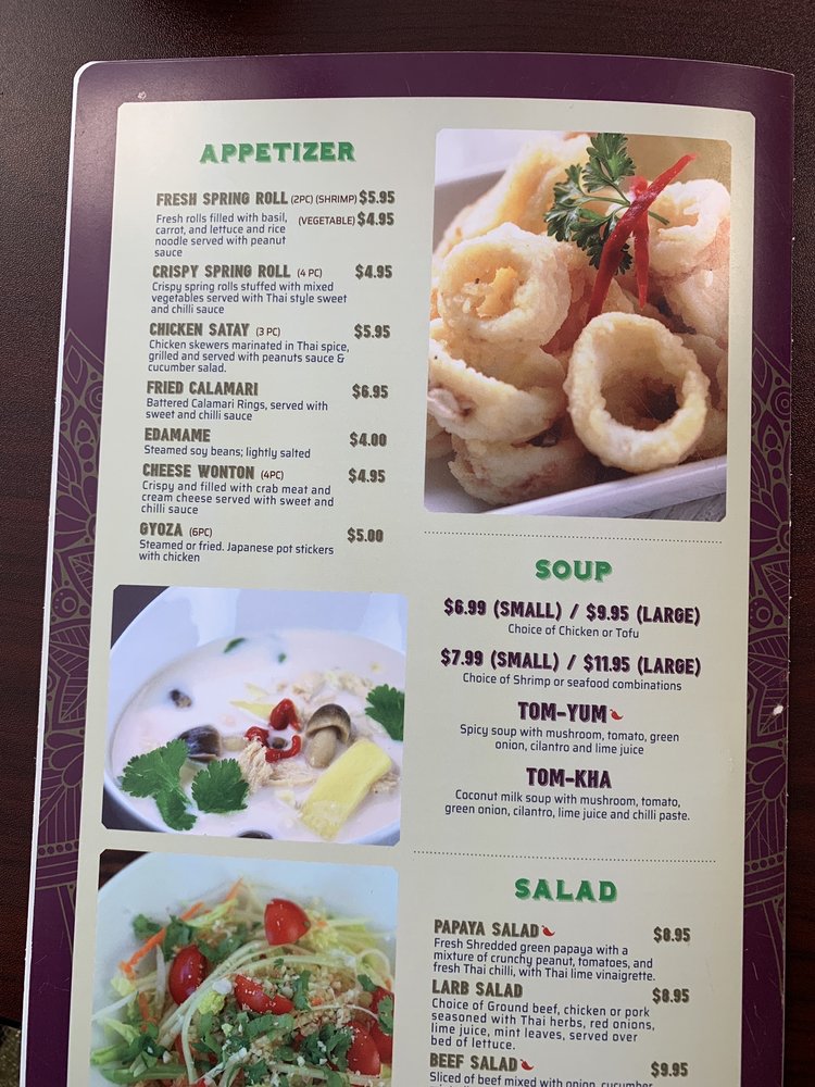 Grilled rib eye steak marinated with thai spices, thinly sliced, steamed broccoli and carrots, served with salad and jasmine rice with tamarind chili dipping sauce.